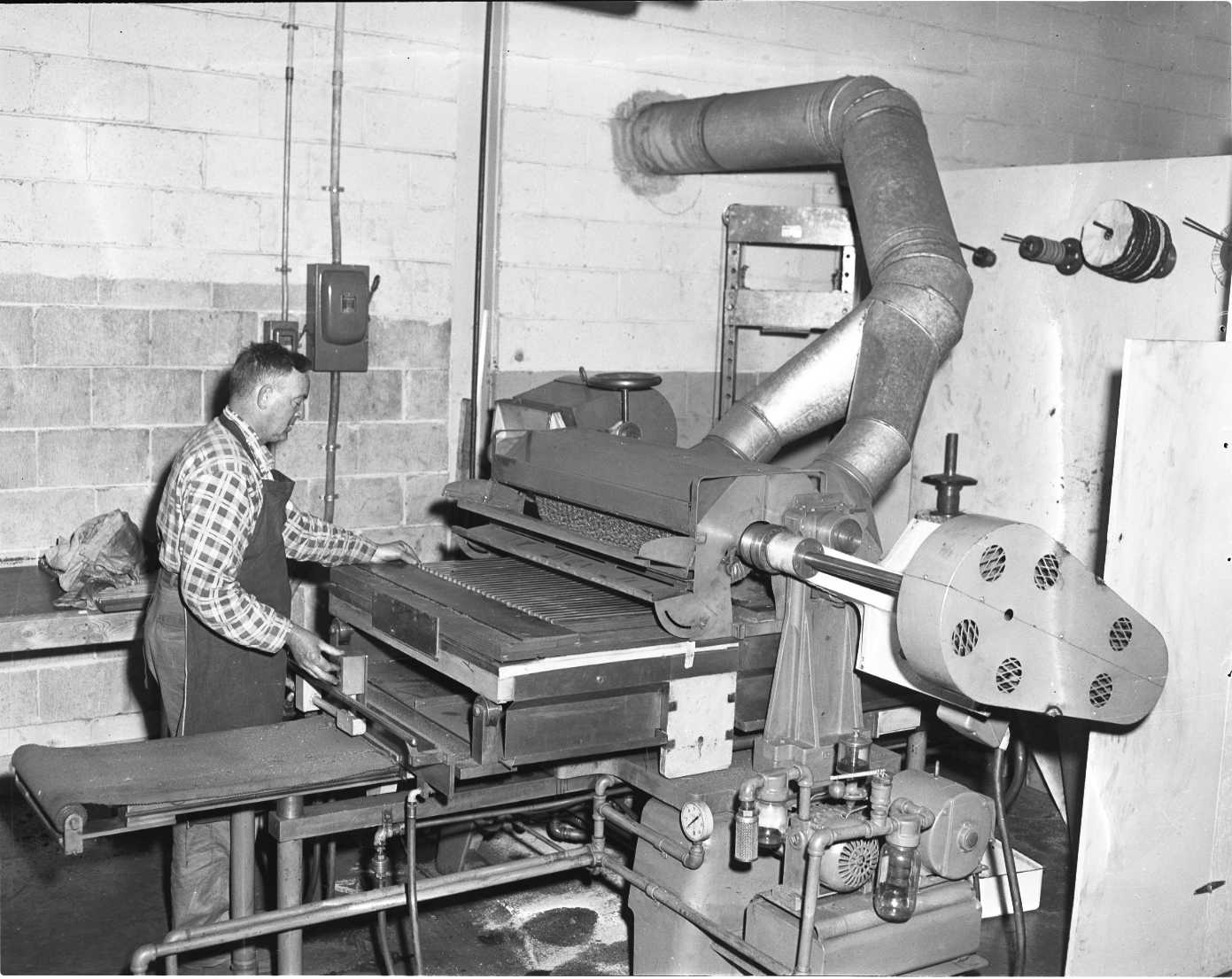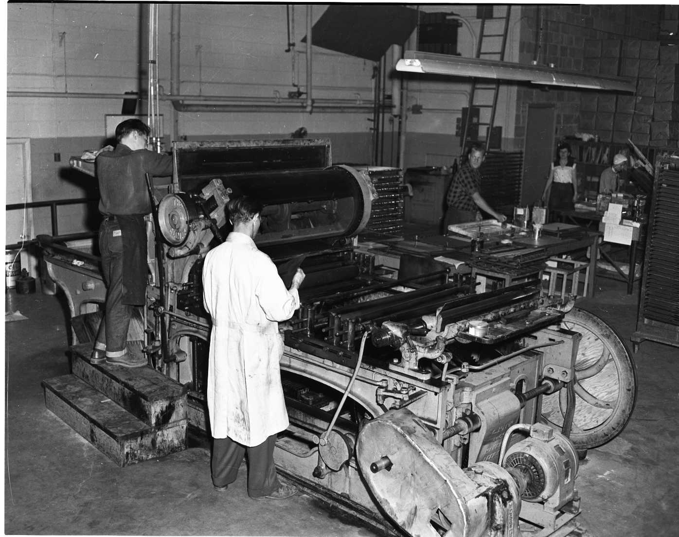 This big power off-set printing press is used for printing acid resisting ink onto sheet metal. Foreman in the white coat is Tom Boast.
