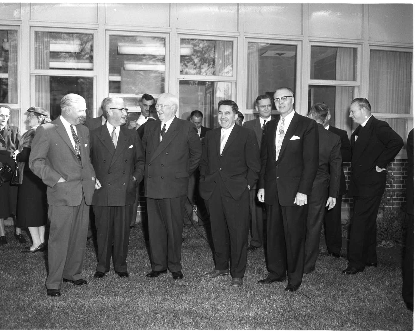 Relaxing on the lawn after the serious business of laying the cornerstone of the new MPDHS, officials are Tom M. McCullough, chairman of the board and W. H. Morrisson vice-chairman; Dr. W. J. Dunlop, minister of education for Ontario; board members, Clarke Edwards and Dr. J. R. Parrott. Facing sideways on the right is Rev. B. G. Brightling of Penetang who conducted the dedication service.