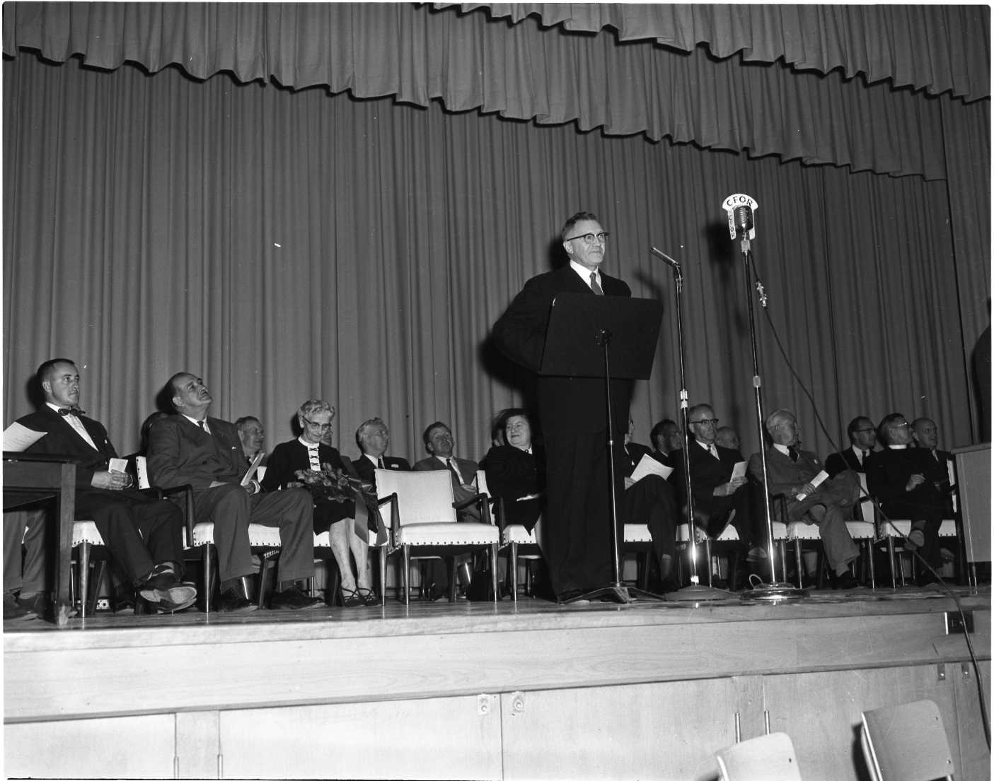 The official opening and laying of the cornerstone by former MHS principal J. J. Robins for the new MPDHS high school in Tay Township just west of Midland. Mr. Robins had been principal of MHS for 32 years prior to his retirement. At an evening function Mr. Robins was presented with a television set in recognition of his long service to the community. Rev. B. G. Brightling of Penetang conducted the dedication service.