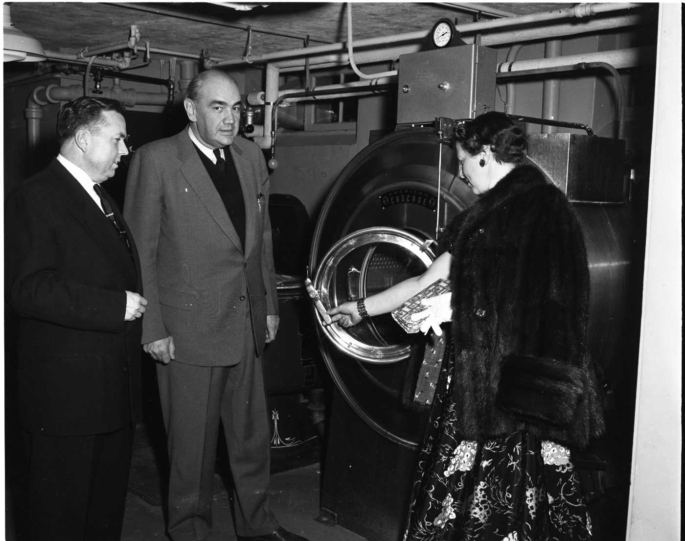 New laundry facilities at St. Andrews are examined by John Burke, building committee chairman, W. A. Robinson, M.P., and former nurse, Mrs. John Burke.