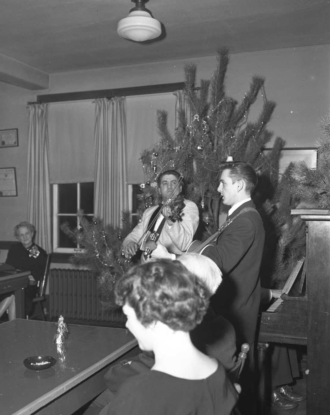 Dec 24th 1956, the Midland Penetang Advisory Committee of the CNIB Christmas party was held at the Midland YMCA, Mel Lavigne with the fiddle and Bill Jivcoff. Pianist Ab Clarke is hidden. They all donated their time.