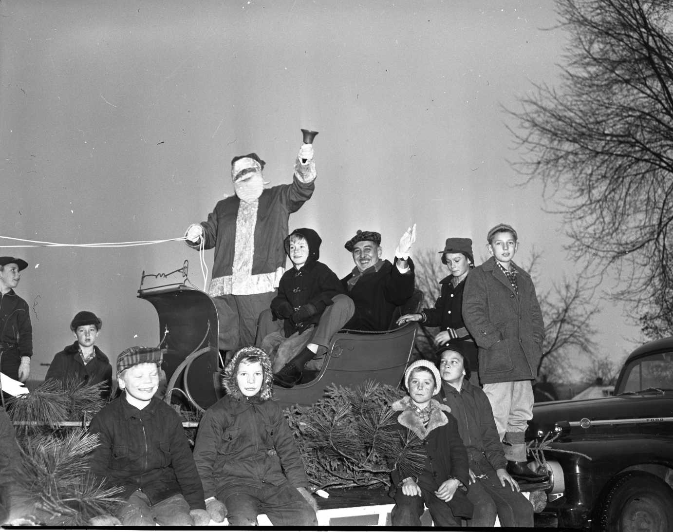 Coldwater Santa Claus parade December 1956. Jovial Lloyd Letherby, MPP for Simcoe East takes a back seat to Santa.