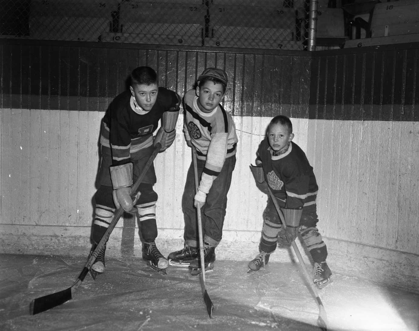 Five hundred Midland and Penetang youth wait eagerly every year for the Little Hockey League to open for the season. Typical age and size of the three groups are; John Argue, Toronto Leafs; Jerry Beteau, AHL Hershey Bears and Earl Scott, a whirlwind on skates for the Junior OHA Marlboros.