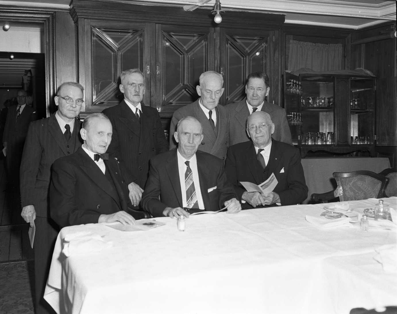 Over 200 years of service to the CPR and its steamship service is represented in this picture taken aboard the S.S. Assinaboia at a dinner marking the retirement of Capt. Joseph Stewart Friday night. Front, Capt. Frank Davis, 83 and retired 18 years from Toronto; Capt. Stewart; S. H. Binns retired locomotive foreman for the Ontario Division, Toronto; back row, Tom Morgan, Port McNicoll, retired chief clerk; Louis Belanger, retired first mate; W. S. Struthers of Midland, who retired recently after 36 years, many as a chief engineer; W. A. Piitz, Penetang, retired first mate with 35 years of service.