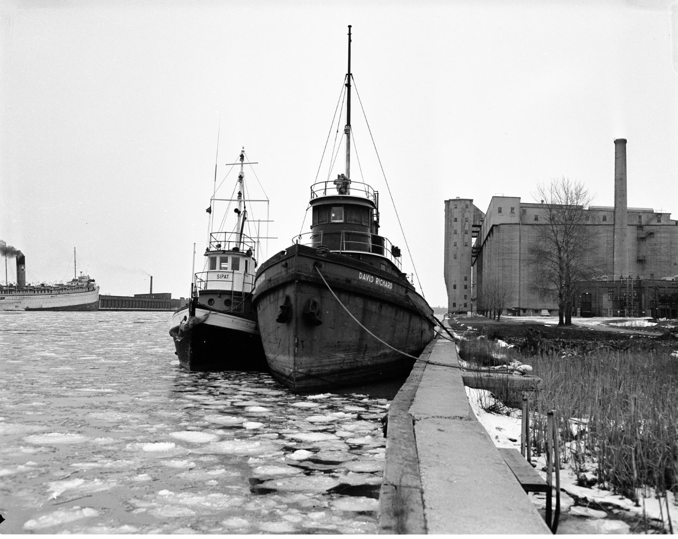 Five day trip from Toronto to Port McNicoll turns into a twenty-one day adventure as these two tugs encountered bad weather. The tug “Sipat” under the command of Capt. C. Courtemarche of Midland left Toronto Nov 16th with the much larger tug David Richard in tow. The 130 foot “David Richard”, was once used to maintain navigational aids in the area and was called the “Murray Stewart”. The big tug is owned by the Waubaushene Navigation Co. and was manned by two employees, Leo Montgomery and Joe Brousseau. At one point on Lake St. Clair sixty mile per hour winds broke both tow cables. On Lake Huron more high winds caused a 12 ton winch to break loose on the David Richard. On Monday the big tug was moved to the Midland Shipyards where cranes removed equipment to make room for a new diesel engine to be installed at Waubaushene over the winter months.