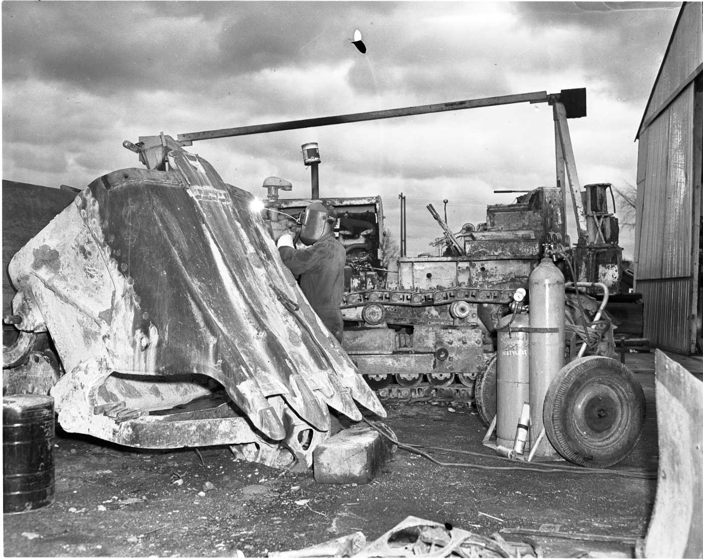 Also at Walter Young Machine Max Garland does a welding repair on a “two yard” bucket from a Lima shovel. Not stated, but likely a piece of equipment from the construction of Highway 103, the Trans Canada, happening at that time near Waubaushene.