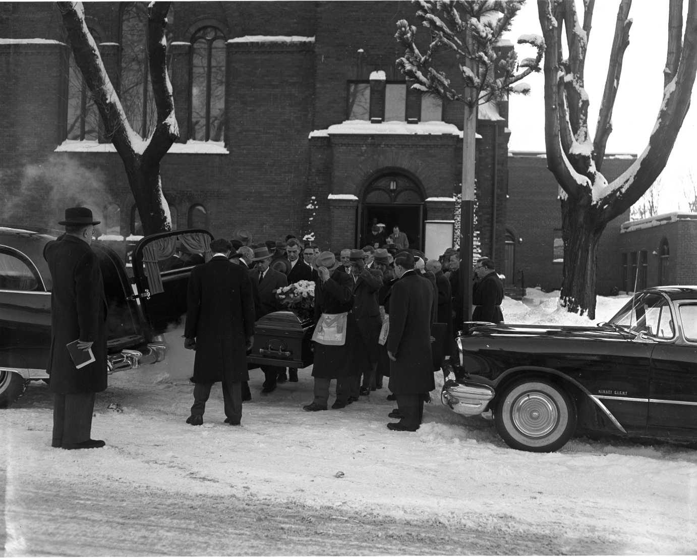 Hundreds of Midland residents paid their final respects to H. J. Thompson at funeral services held at St. Paul’s United Church. The casket is seen passing an honour guard composed of members of Caledonian Lodge A. F. and A. M. of which Mr. Thompson was a past master. Active in many phases of the town’s life during his 50 years residence here, Herman Thompson died suddenly at his Yonge Street home Monday afternoon, he was in his 66th year. Mr. Thompson was a member of St. Paul’s United Church, where he had been a member of the Board of Stewards for many years. As co-chairman of the Building Committee, he also played a prominent part in the raising of the money for the large new addition to the church opened in late 1955. Born at Woodford, a village near Owen Sound, Herman Thompson was only in his early teens when he came to Midland in 1907. In 1914 he became associated with T. J. Campbell, who had established a plumbing and heating business on King Street at the turn of the century. In 1951 the firm of T. J. Campbell and Co. Ltd. surrendered its charter and became H. J. Thompson and Sons Ltd. Mr. Thompson became president, with Mrs. Thompson as vice president, Miss Charlotte Thompson (his sister) as secretary, and his son Jack, as treasurer. His other son, Bill, was also associated with the firm, which in later years expanded to include plumbing, heating, sheet metal and electrical contracting and appliance sales. (The Bill Thompsons were strong supporters of Huronia Museum). In addition to his many business connections, Mr. Thompson served the town in a variety of organizations. A staunch supporter of the chamber of commerce, he had served as president and was chairman of the Industrial Committee when many new industries were secured. Mr. Thompson also served the town for a quarter-century on the old Board of Education and for a like period as treasurer of St. Andrew’s Hospital. But Mr. Thompson is perhaps best known for his interest in the Midland YMCA; on whose board he served for 30 years, including four as president. He also found time to serve on municipal council for two years, one term of which was as deputy reeve. Mr. Thompson also served his country in two world wars. In the first, he attained the rank of captain in the Grey and Simcoe Foresters and served overseas. In the second, he served equally well at home as Midland chairman of eight of the nine victory loan campaigns. In ill health in recent years, Mr. Thompson had been forced to curtail most of his community activities. Surviving are his wife, the former Edith Bateman of Mount Forest; two sons, Jack and William; a sister, Miss Charlotte Thompson; and a brother, W. Ewart, all of Midland.