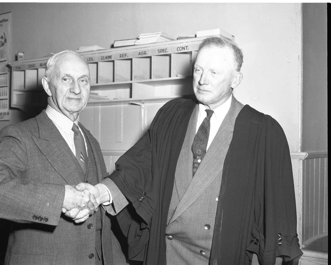 Reeve W. H. Keller of Midland, on the left, congratulates Simcoe County warden Fisher Ganton of Medonte after his election Tuesday in Barrie. Keller’s defeat downed Midland’s hopes for their first Reeve in 40 years.