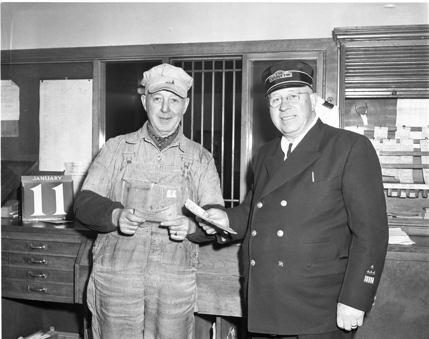 Almost half a century of railroading came to an end Saturday when CNR conductor Jack Milburn, on the right, made his last run from Midland to Lindsay. He began his career in Lindsay as a brakeman in March of 1910 and still makes his home there. He is seen handing his orders to Engineer Jack Graham, a long time neighbour in Lindsay.