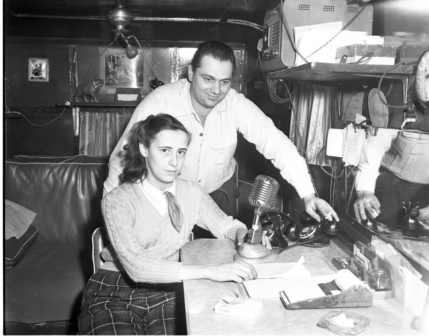 New owner of Wilson Taxi in Midland, Joe Levechia gets help from his wife Eleanor (nee Reynolds of Midland), seen speaking to one of the radio directed cabs from their trailer office on Dominion Ave. Mr. Levechia who comes from Port Colborne was a sailor for eleven years before buying the taxi business from Meredith Wilson.