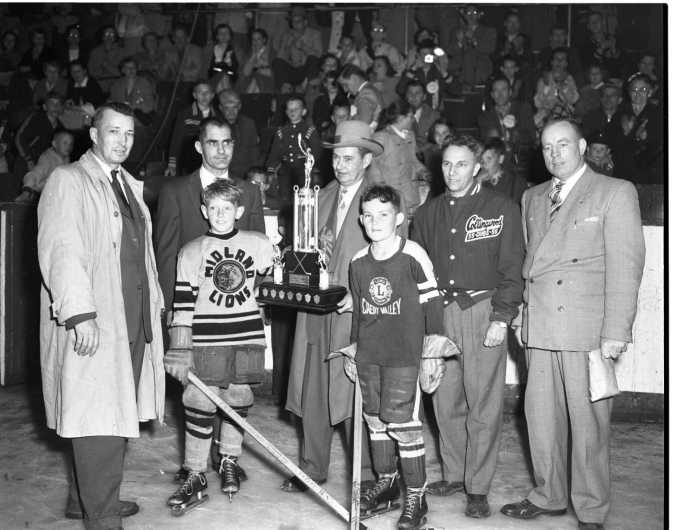 League director, Rev. Len Self and team captain Chester Graham beam as they receive the LHL Jr. A Trophy. Captain Jim Stanfield of the losing team, “Babe” Schultz of Collingwood, Keith Carruther Port Hope Ontario LHL vice-president, Keith Kirby Collingwood recreational director and the manager of Toronto Twp. team are the others in the photo.