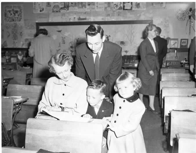 Open house at Port McNicoll Public School. Little Kent Biggar, 8, has his work inspected by his dad Ted Biggar who is chairman of the school board in Port. Mom and sister Debra, 5, look on.