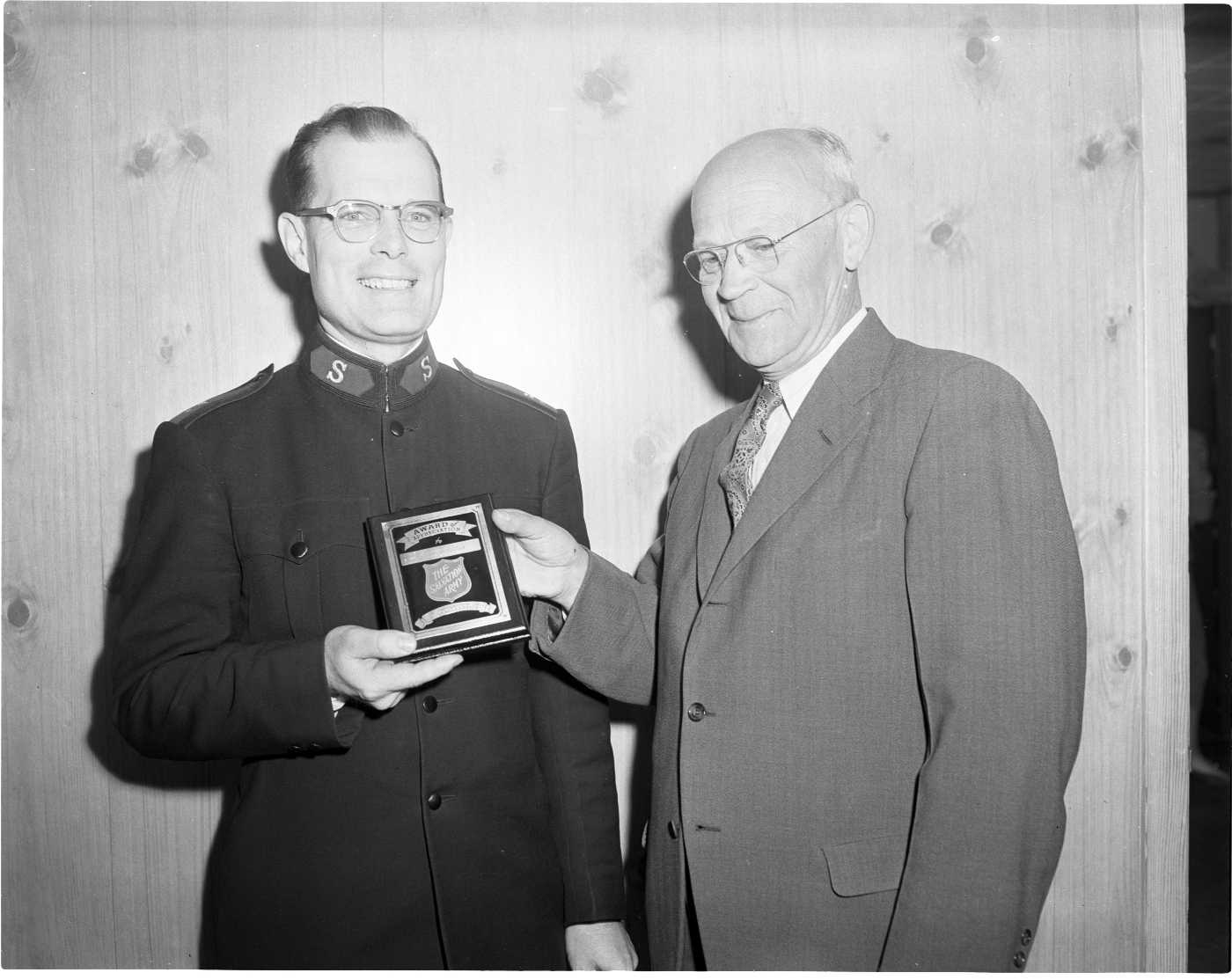 An award of appreciation is presented to Midland CIBC bank manager R. G. Gillies by Capt. Ray Smith of the Salvation Army for 14 years service as treasurer of the Red Shield appeals in North Simcoe. The presentation was made at a Kiwanis Club meeting.