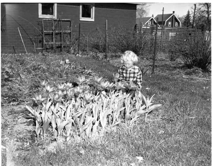 Admiring a bed of bright red tulips on the lawn of Mrs. A. Irish, 335 Manley Street is Patsy Beatty, 4 year-old daughter of Mr. & Mrs. Ken Beatty.