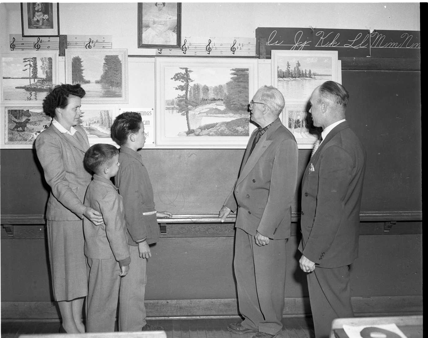 Something extra at the Port McNicoll Public School open house was a display of oil paintings by 11 year old student Bobby Duncan. Last winter he took his first lessons in oil from Duncan Armbrest of Midland. Pictured are Mrs. Duncan, Douglas 8, Bobby, Mr. Armbrest and father Bruce Duncan.