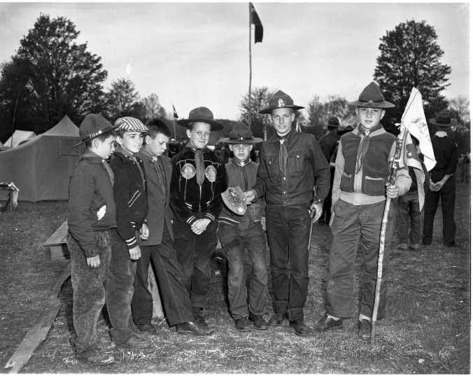 Proud of the plaque they were awarded at South Georgian Bay District Scout camp over the weekend are members of Fox Patrol, 1st Midland Troop. Tom Gordanier, Murray Mostyn, Paul Downer, Doug Faint, Bill Howard, Ross Clute (patrol leader) and Ken Cleary. The plaque was presented during visitor’s day ceremonies at the Sturgeon River camp site.