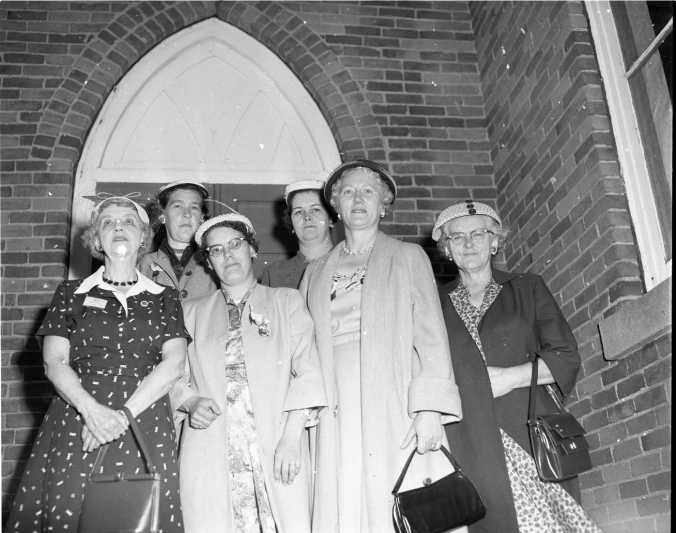 North Simcoe Women’s Institutes re-elected their entire slate of officers at the annual meeting in North River United Church May 22. In the front row, left to right, are secretary-treasurer Mrs. M. C. Long of Waubaushene, third vice-president Mrs. Ernest Ayers of Jarratt, first vice-president Mrs. Beverley Walker of Eady; back row: second vice president Mrs. Ed Sallows of Warminster, area chairman Mrs. G. R. Lane of Coldwater and president Mrs. Lloyd Dunlop of Moonstone.