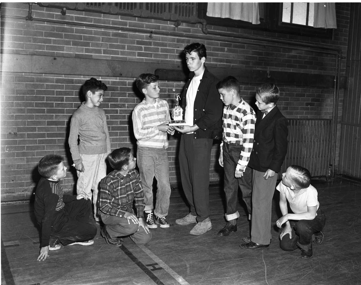 Winners of the Midland YMCA floor hockey league this year were the Mustangs, seen receiving the Unamotus Trophy from Ken Mackie president of the Unamotus Hi-Y Club. The trophy was awarded on a basis of teamwork and attendance, as well as on league standings. Left to right are, Bob Strickland, Gerald Karch, Dave Carpenter, Jerry Beteau, Ken Mackie, Neil Murday, Randy Knapp and Bob Weckman. The boys were also presented with crests, saw a movie and were stuffed with ice cream and cake.