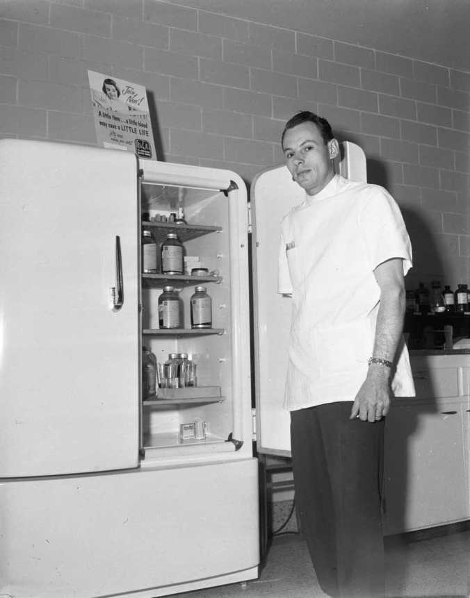 Donors are needed for the “walking blood bank” at St. Andrew’s Hospital as even this modern refrigerating unit can only keep stored whole blood three weeks. Lab technician Bill Zinck reports that human donors reduce waste by making blood available only when needed.