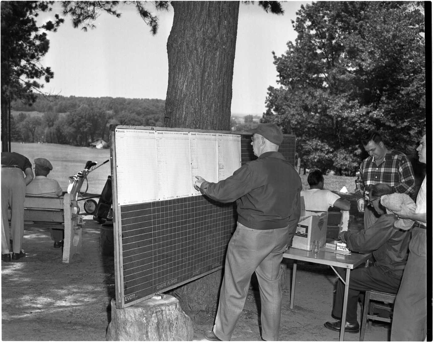 Nearly ninety golfers from several Simcoe County clubs turned out for the open invitation match held at the Midland Golf & Country Club June 12th. The eventual winner was Walter “Windy” Varty from Orillia with a gross of 76. Pictured are A. I. “Doc” Merchant checking the scoreboard while club captain Norm Greene takes Clive Parks entry fee.