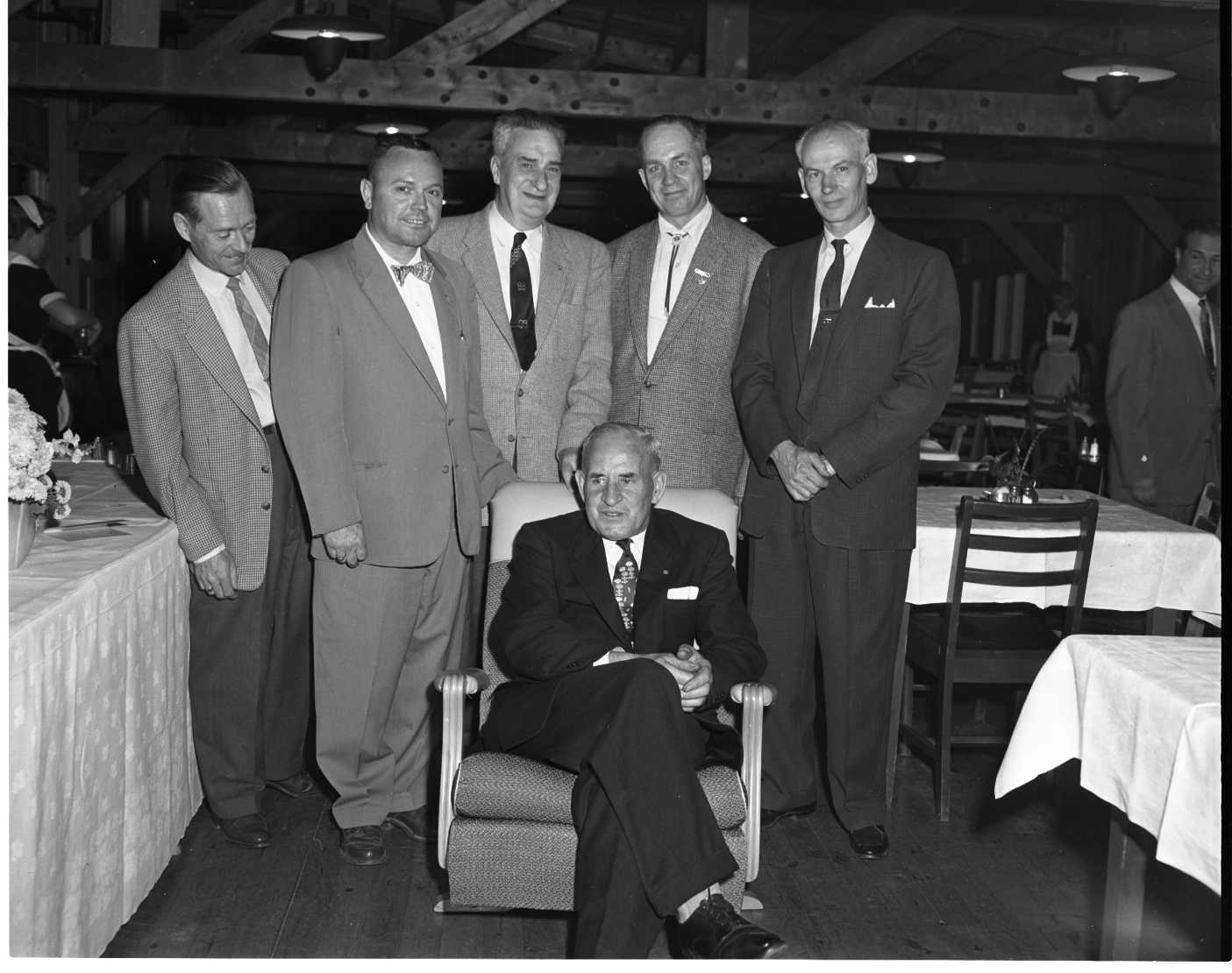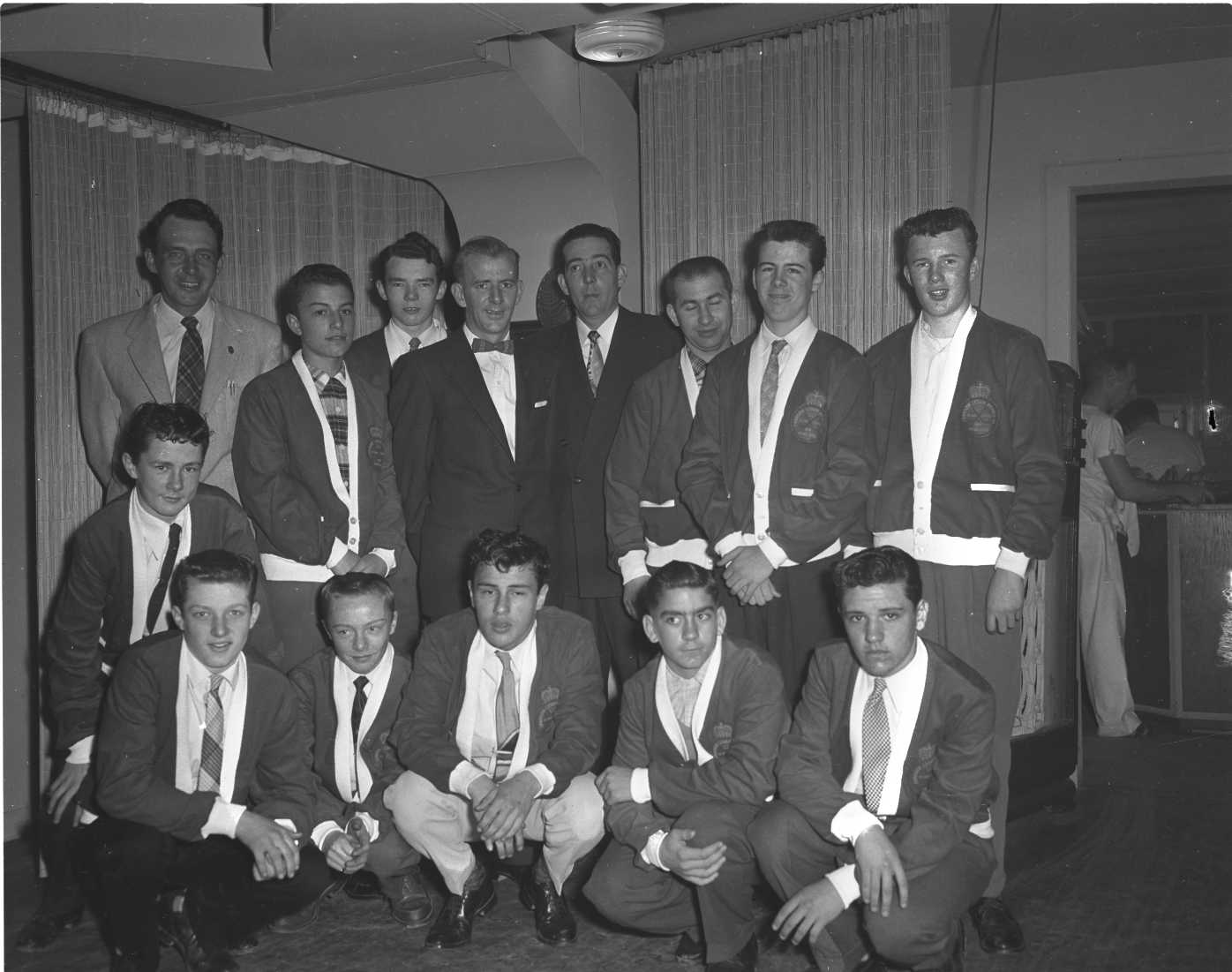 Bulging with chicken and banana cream pie, members of the K-W Dutchmen, Legion Branch 80’s entry in the senior OHA division of Midland’s Little NHL, posed for the County Herald camera following a dinner in their honour at Bourgeois’ dining room Tuesday night. The boys are wearing snappy new sweater coats donated by the Legion branch. Also in the picture are Legionnaires Graydon Rodgers, Don Gallivan and President Charlie Scott, along with coach Morley Spiker. March 28, 1958