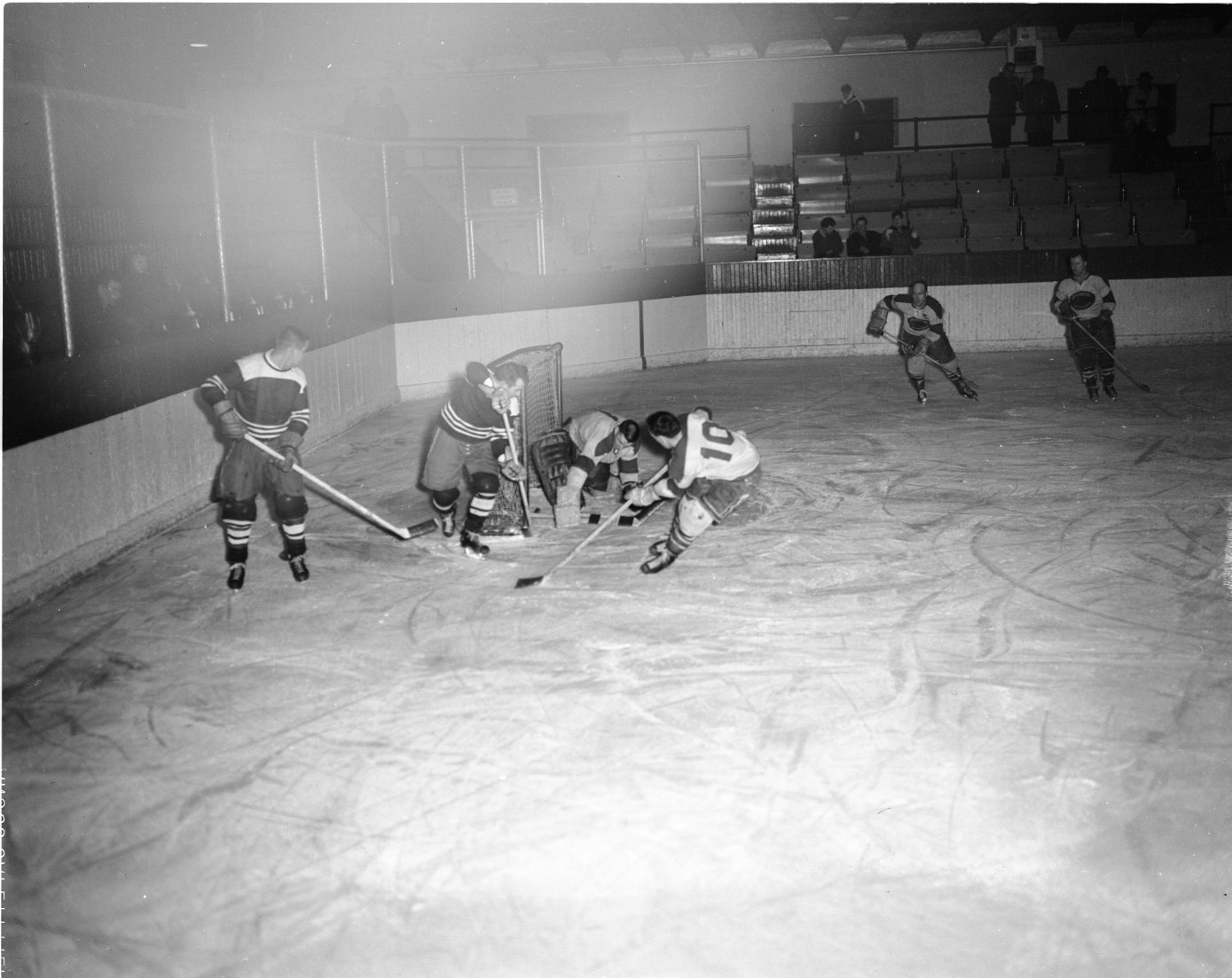 Coming up with one of his greatest efforts in a long career, Midland Flyers’ Morley Spiker scored five of his team’s goals in a 6-4 win over Meaford Chevvies here last Wednesday night. Spiker is seen poking the first of his quintet behind goalie Elgin Cubitt while Meaford forward Barney Walmsley (10) rushes in too late to help. Flyers host Collingwood here tonight. January 13th, 1960. (Not the best photo but it shows how Morley got his nickname, the “Haunt”, for the way he was always around his opponents net.”