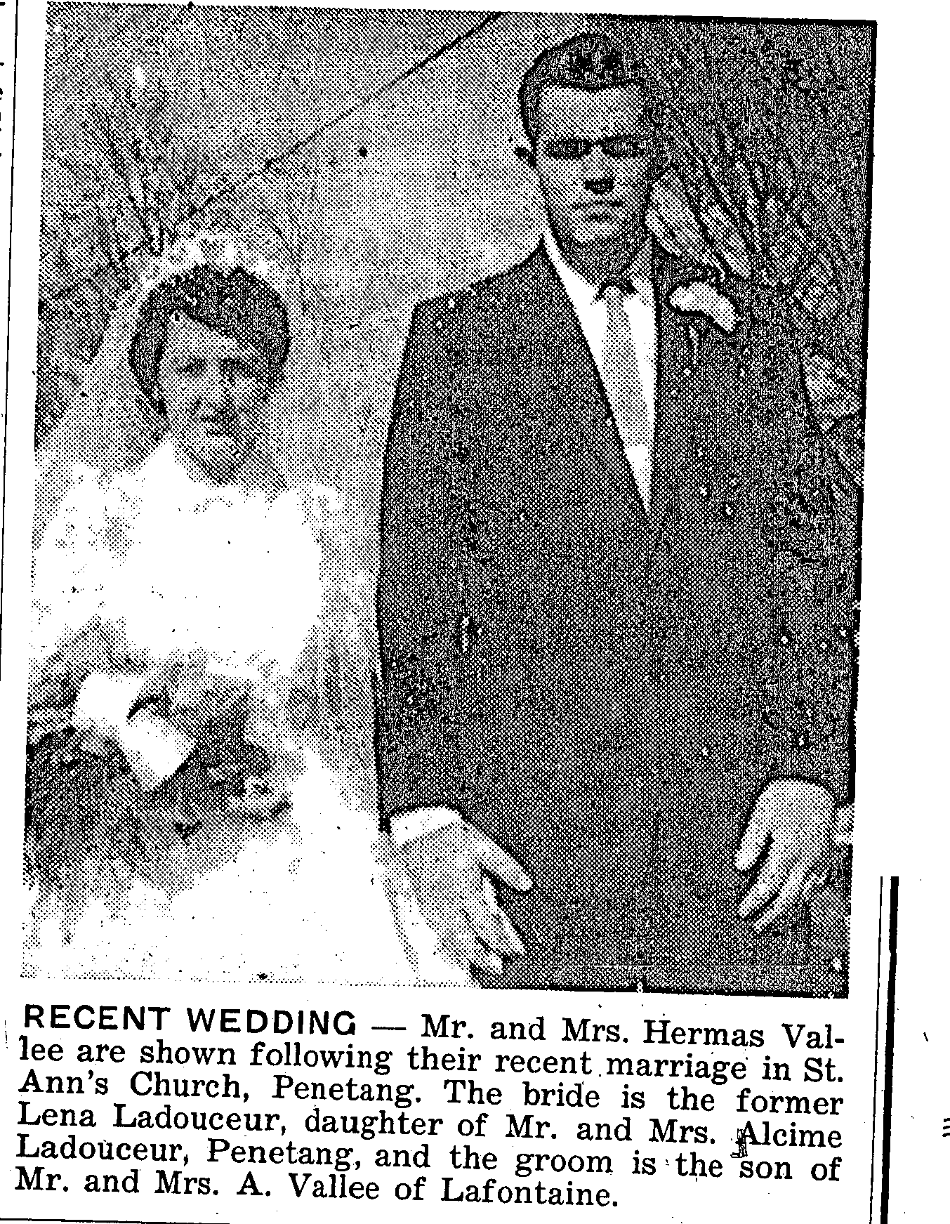 - OBITUARY: Funeral service for Mrs. J. Cena Brunelle, Penetang, was held in St. Ann’s Church, Penetang, Monday, June 3, with Rev. L. McGough officiating. Interment was in St. Croix Cemetery, Lafontaine. Pallbearers were Roger and Martial Brunelle, Roland, Celestin, Gabriel and Urbain Maurice. The former Lena Payette, Mrs. Brunelle died in Penetang General Hospital Friday, May 31, following a short illness. Born in Lafontaine. June 13, 1892, she spent her early life and married J. Cena Brunelle there in 1910. The couple moved to Penetang 30 years ago. She was an ardent gardener, and particularly interested in horticulture. Many people in Penetang admired her flower gardens which were one of the town’s show places each year. She was a Roman Catholic. Surviving, besides her husband, are six sons. Maurice, Eugene, Marc and Joseph of Penetang, Cleo, Montreal, and Jacques, White River; and five daughters. Mrs. J. Crawford and Mrs. Art Roy, Sudbury: Mrs. E. C. Macleod, Toronto: Mrs. Ross MacDonald, Montreal, and Annette at home. One sister, Mrs. A. Desroches, also survives.