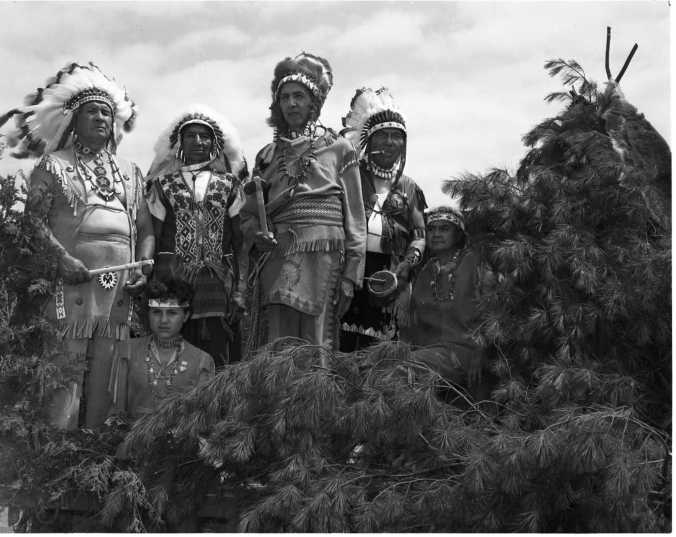 Attractive float in the summer carnival parade in Midland on the Saturday of the holiday weekend was this one carrying members of the Six Nations Reserve near Brantford. The group has also been appearing at the Huron Indian Village in the park. Known as Martin’s Indian Troup the members are Gordon Martin, Shanty Johns, Alex General, Jacob Henry and Mrs. Martin. Young girl in front is Loy Hill.