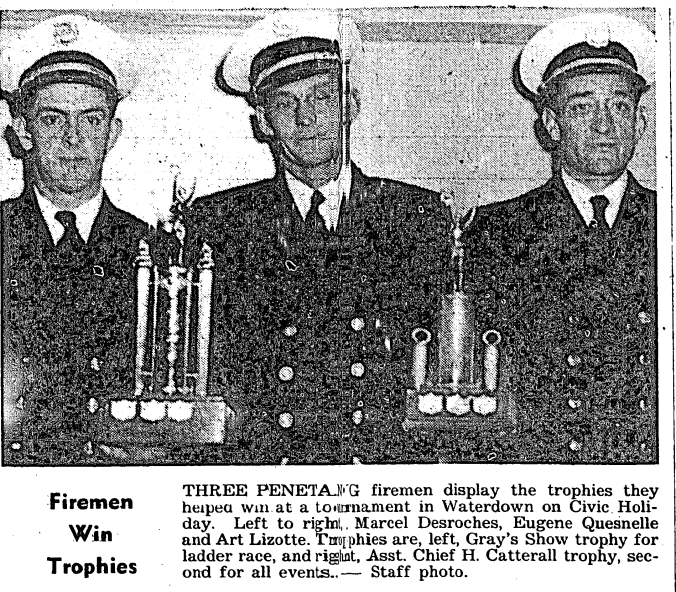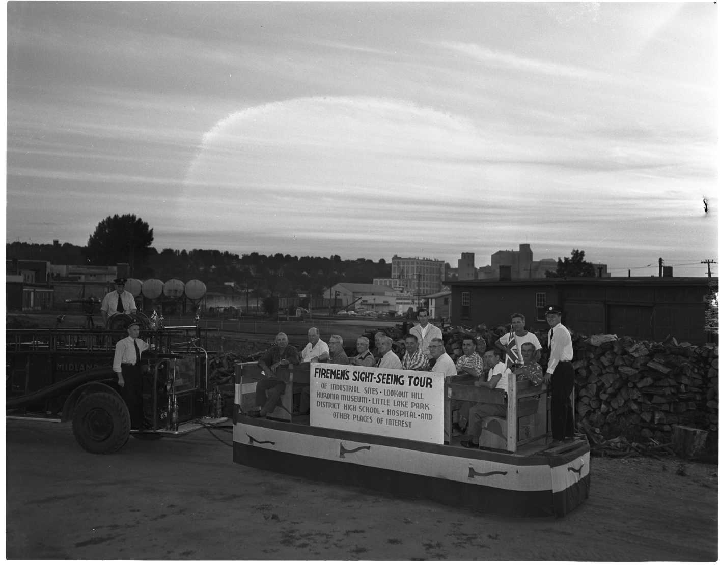 So successful was their venture over the holiday weekend, Midland firemen plan to operate their sight-seeing tours of Midland each Sunday from now up to and including Labor Day weekend. On the back of the old fire truck, which provides the motive power for the jitney are Chief Arnold Tippin and Irwin Jackman. In the bus are Earl Allsopp, Dalton Jennett, Art Murday, Hank Woods, Mac. Perrin, Phil Blake, Jack Small, Fred Grigg, Jack Argue, Pete Staruck, Jack Pardon, Doug Martin, Harry Howard, Harold Hamilton and Dave Hudson.