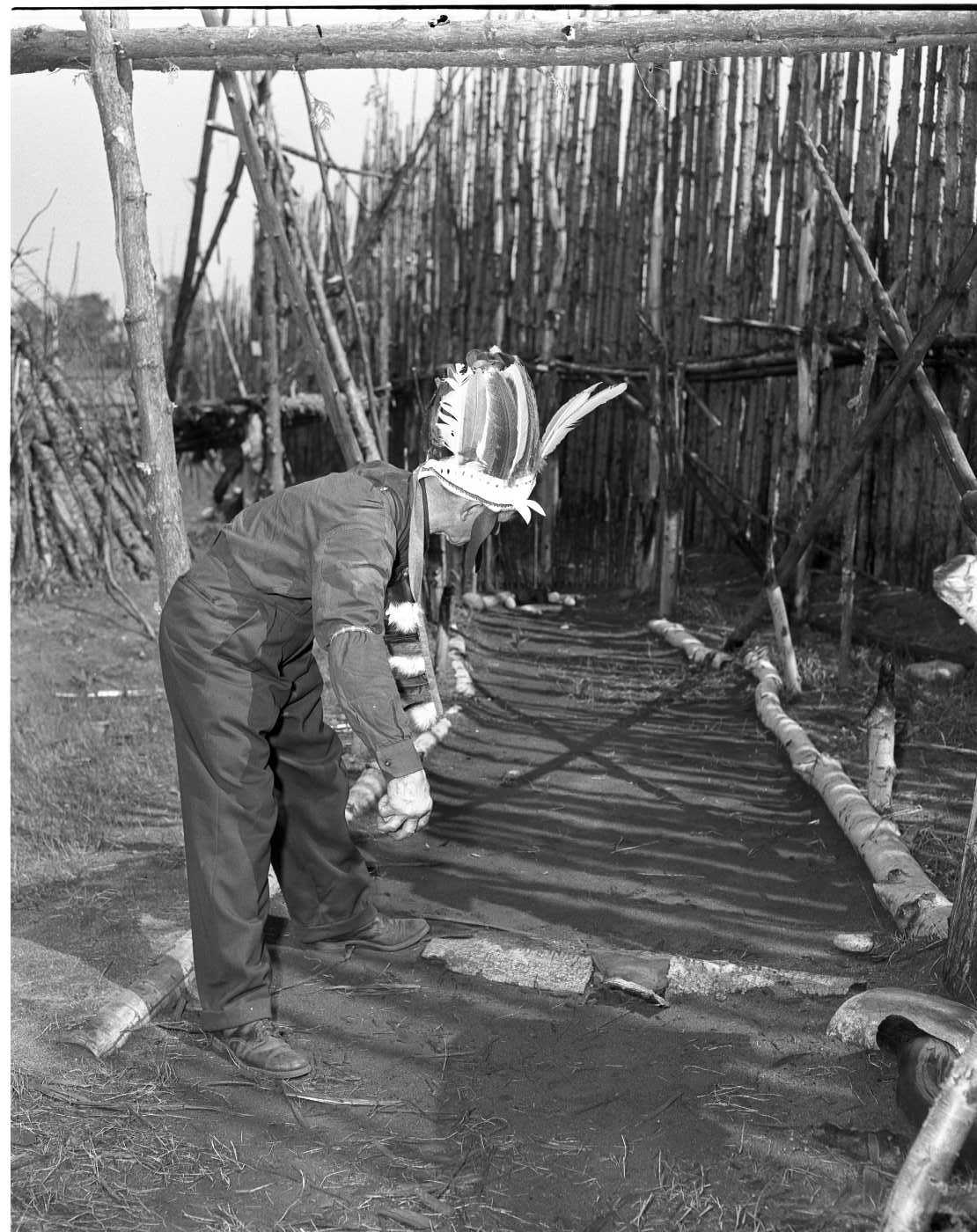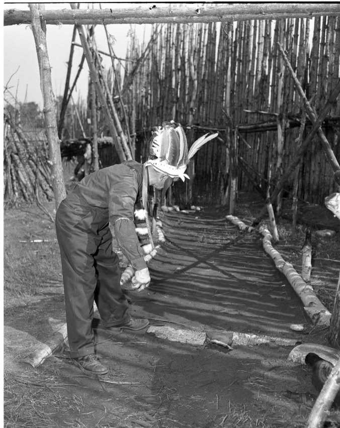 Native bowling alley is one of the new attractions at the Huron Indian Village in Midland this year. Stewart Guthrie demonstrates how round stones were rolled to knock other stones off of a flat rock.