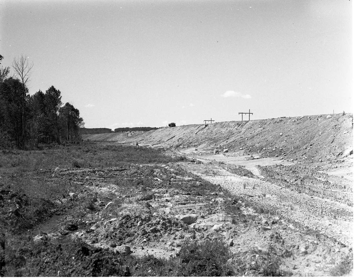 Many thousands of yards of fill have gone into the new arm of the Trans-Canada Highway where it circles Waubaushene on the east. The road has been built up here to provide for an overhead bridge over the CNR tracks which cross at the end of the bush on the left. Another new bridge will go in to cross the gap at the neck of Matchedash Bay.