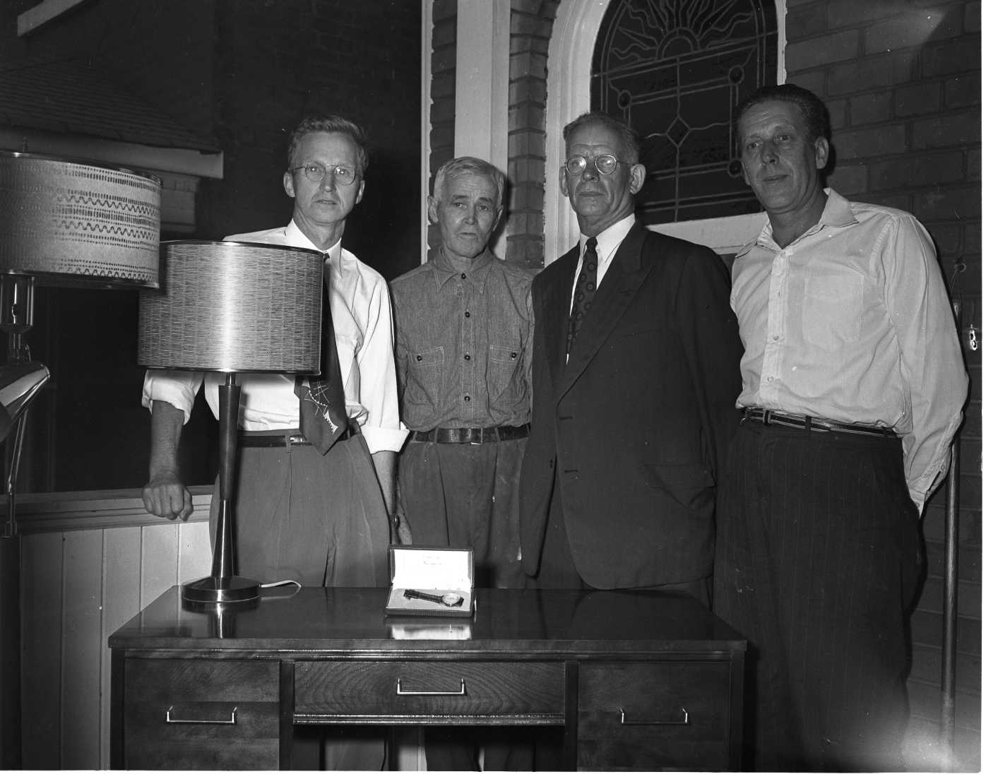 Thirty three years of service to Pillsbury of Canada Ltd. and the flour mills that preceded it on the same site, came to an end Friday for 70-year-old R. J. Williamson. The occasion was marked by the presentation of gifts from the company and fellow employees. Vic Wadge, Mr. Williamson, Jack Lang and Jack Cleaver, all veteran employees of the Midland mill. Mr. Williamson started his career in May of 1924 with the Copeland Milling Company. He resides at 297 First Street.