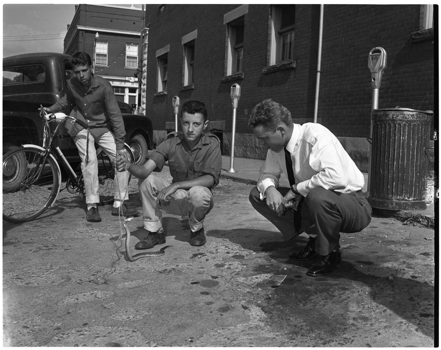 This 30-inch snake attracted attention when it was brought to Midland by Ernie Kirkup this week. Ernie found the snake under a cherry tree on his farm near Ebenezer and believes it is an adder, onlookers are Allan Kirkup, 15, and Bob Bates of Midland.