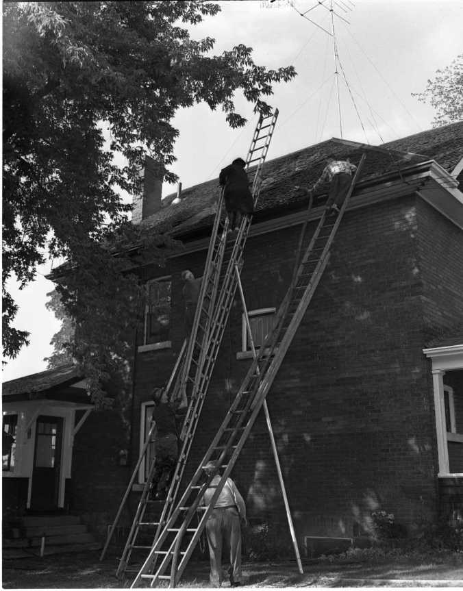 Ladders were the order of the day late Tuesday afternoon when Midland firemen were called to a roof fire at the home of Alderman Clint Smith, 270 Bay Street. Although damage was not serious, it appeared much of the roofing material would have to be replaced.