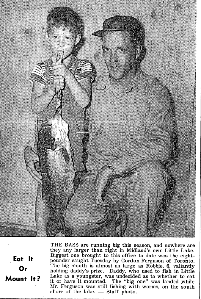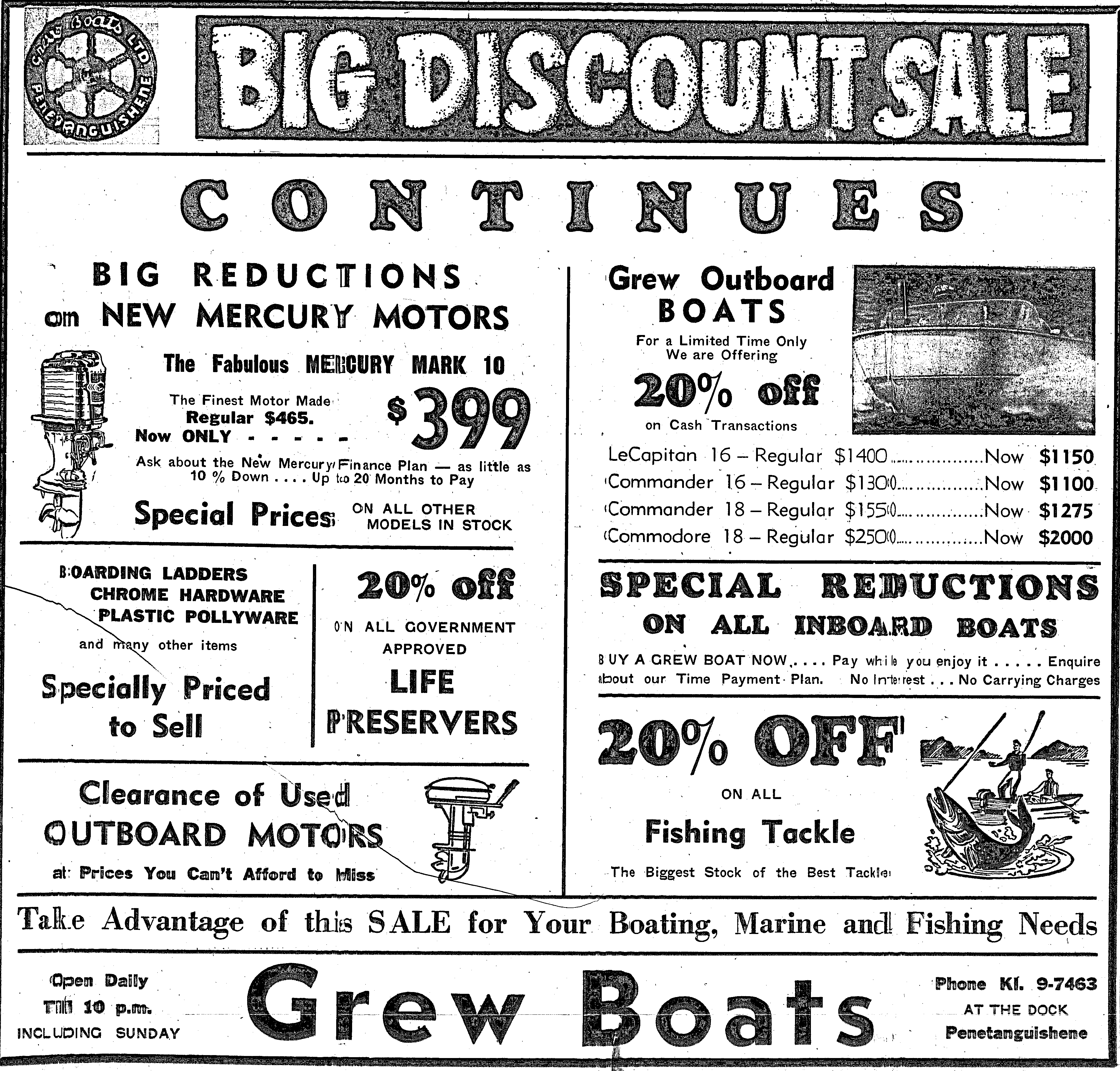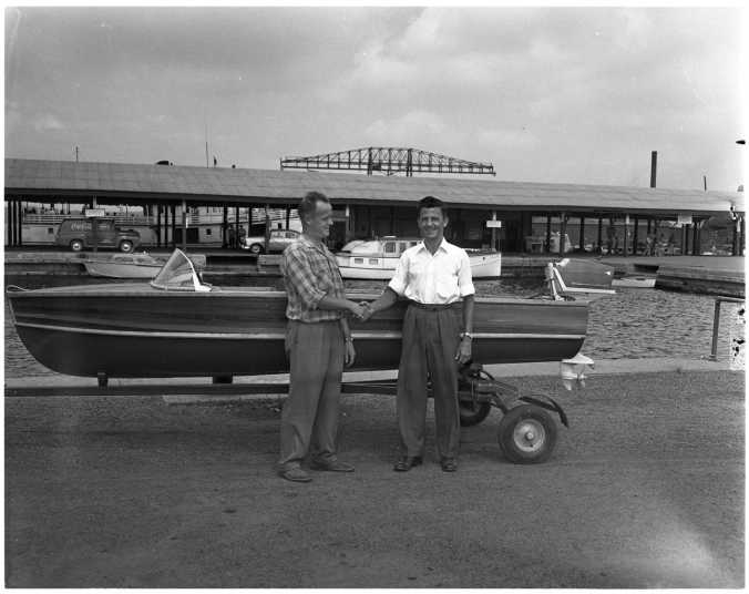 There were a lot of disappointed people all over Ontario as well as Midland when the draw was made by Midland Rotary Club for this outboard boat, motor and trailer recently. One real “happy fellow”, however, was Dr. Dalton Martin of Midland, right. He was the lucky winner. Jack Duggan is seen turning the prize over to Dr. Martin at the town dock Wednesday afternoon. Jack was in charge of the boat selling campaign for the Rotarians.