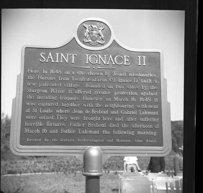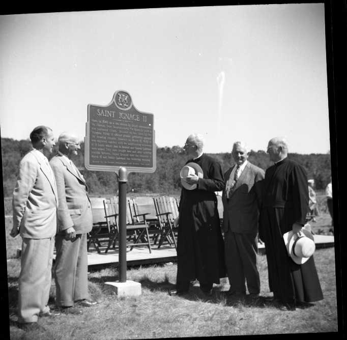 The unveiling of the Ontario historical plaque marking the site of Saint Ignace ll and the martyrdom of the Jesuit missionaries Fathers Lalement and Brebeuf. The site is on the east side of Concession 8, now Rosemount Road, south of Highway 12 and south of the Sturgeon River. In the photo is Bernard Leclair, George M. Johnston, MLA; first director of the Martyr’s Shrine, Rev. J. M. Fillion, Dr. W. W. Jury and Rev. John McCaffrey, present director of the Shrine.