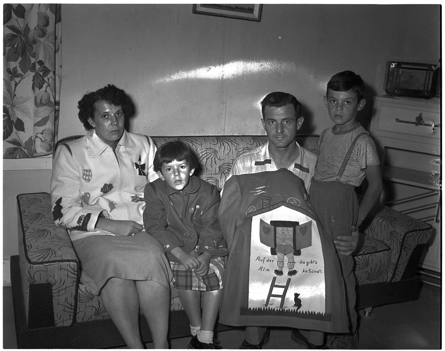 Midland family returns home after three years stationed at the RCAF base in Baden Solingen Germany. Aero-engine technician Cpl. Gerald Hurl displays jackets embroidered in Germany with folklore images. Children are Raymond, 8, and Valerie, 6.