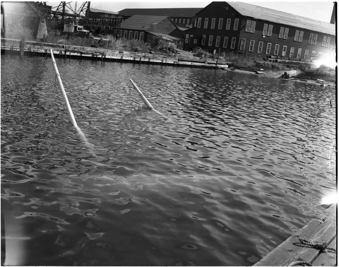 High winds last week are believed to have been the cause of the sailboat “Mary Anne,” belonging to RCSCC “Huron,” sinking in the slip nearest Midland Shipyard. Only the two masts of the vessel are above water when this picture was taken. The rest of the boat can be seen just below the surface.