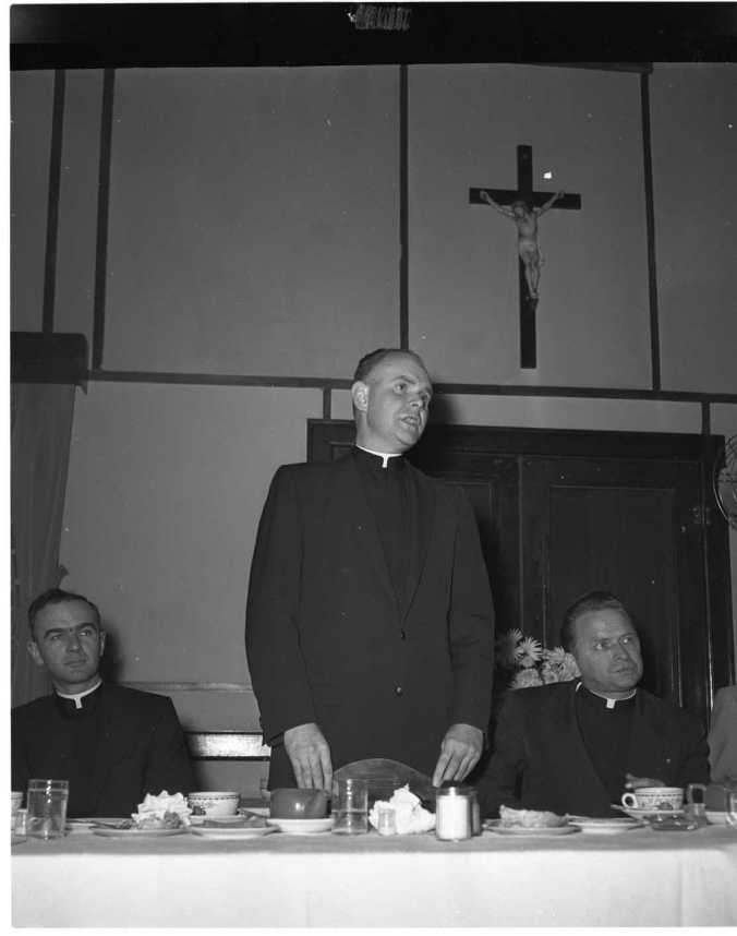 Guest speaker at the convention of District 20, Ontario English Catholic Teachers Association at Martyr’s Shrine October 2 was Rev. J. P. Finn, Ph.D. diocesan director of education in London, Ontario. At his right is Rev. J. S. Howe of Victoria Harbour, who thanked the speaker.