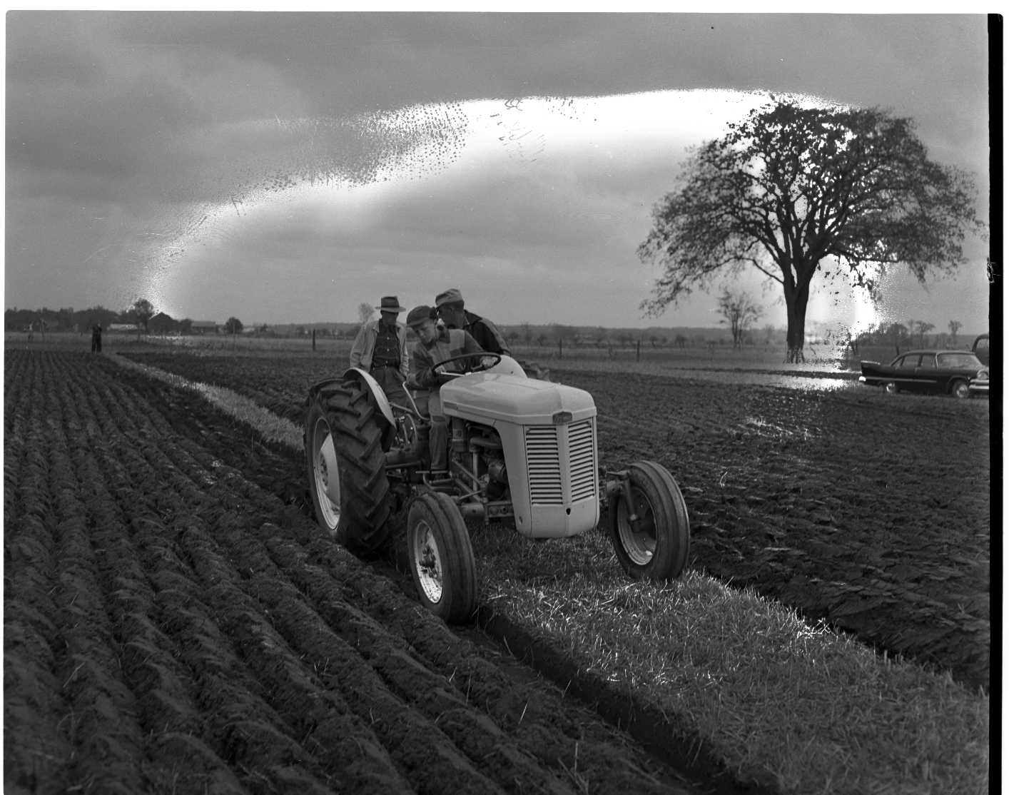 Officials of the Center and West Simcoe Branch of the Ontario Plowmen’s Association judge the competitors work during the plowing match held near Elmvale Wednesday. Kneeling is Mervin Fralick, Minesing, 1st vice-president. At rear is John Partridge of Minesing, a past president; J. E. Carruthers current president from Stayner and George McGinnis of Elmvale, 2nd vice-president.