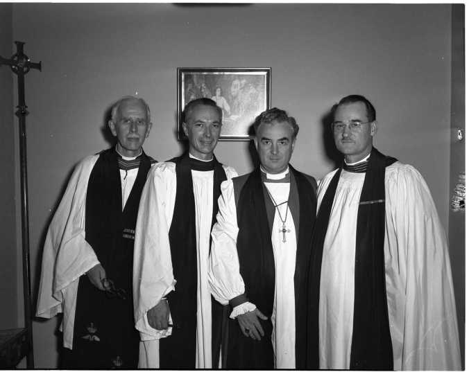 Rev. Lloyd J. Delaney is inducted as the new rector of St. Mark’s Anglican Church Midland on Friday night. Archdeacon Gilbert Lightbourne, Shanty Bay; Mr. Delaney; Rt. Rev. G. B. Snell PhD., D.D., suffragan Bishop of Toronto and Ven. G. B. Ongley, M. A., Archdeacon of Peterborough.