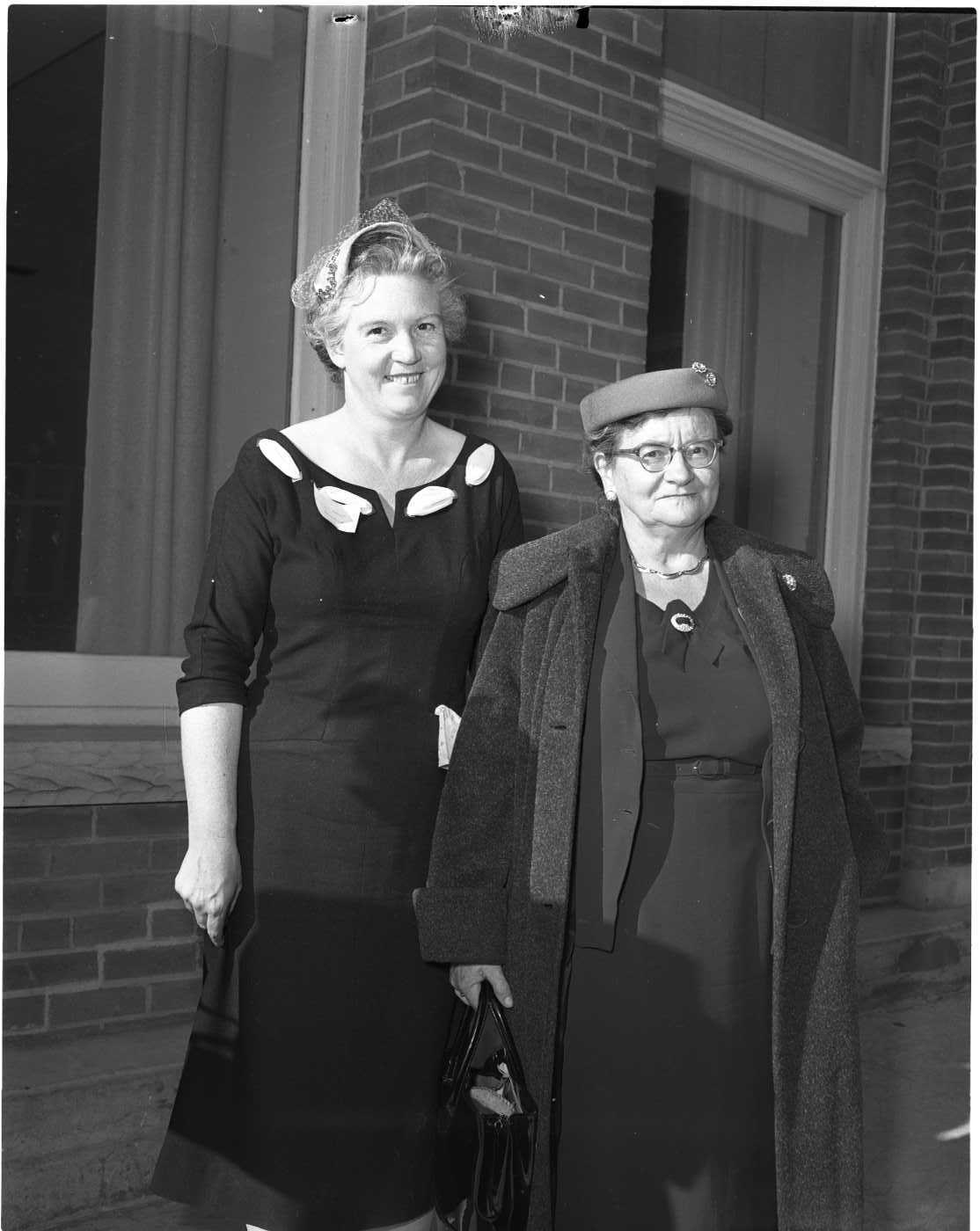 Mrs. Bruce Holt, left, president of the Midland YMCA Auxiliary, is shown with the new president of the Inter-Provincial Ladies Auxiliaries to the YMCA, Mrs. C. A. Overall of East York during their annual convention held in Midland.