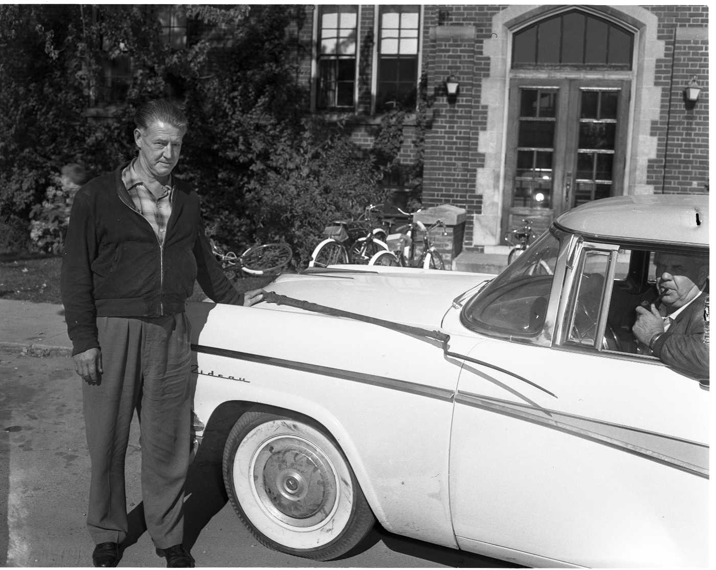 Outlined on the hood of this white car driven by Billy Logan is a rusty old musket found by Morley Hawke while helping to clean up the basement of a King Street store last week. Complete with a bayonet, the old gun is of the muzzleloading type. Mr. Hawke happened to notice part of it sticking out of the floor.