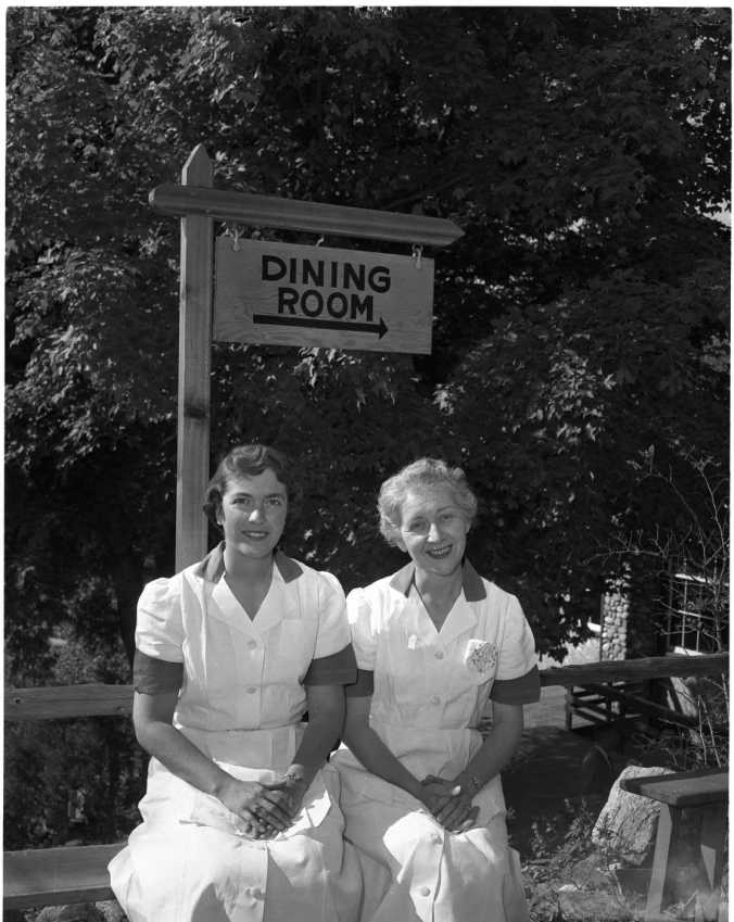 Nobody knew that two of the waitresses at the luncheon of the district convention of the Ontario English Catholic Teachers Association at the Martyr’s Shrine October 2nd were actually Shrine guests who volunteered to help out. Windsor social worker Beverly Ord just returned from a year of camping, travelling and working in Europe. American born Caroline Holland, right, makes her home in Rome, where she belongs to the novel “Opus Coenaculi” a secular institute which helps the church.