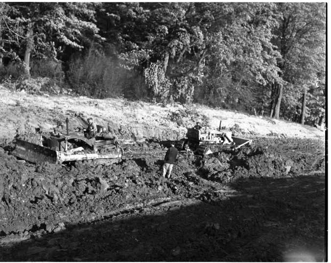 Bulldozers working on a road cut on Conc. 1, Old Survey, Tiny Township encounter heavy clay muck that causes them to become stuck repeatedly and requires them to rescue each other.