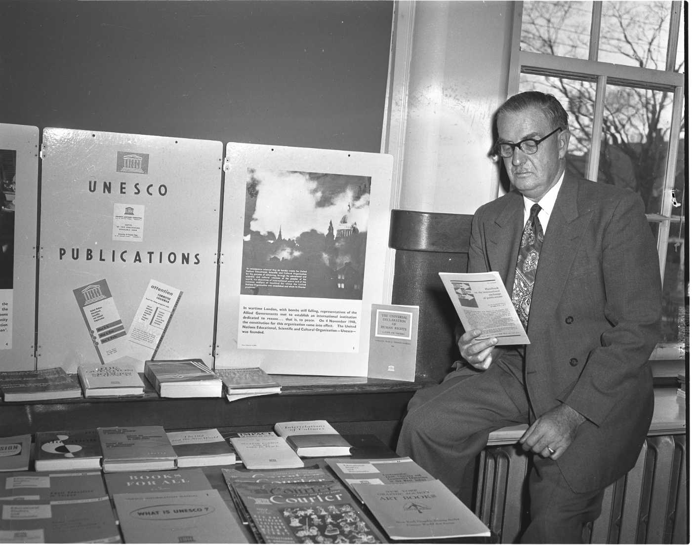 Midland librarian Dawson Leigh studies one of the pamphlets in the library’s display of publications by UNESCO, the United Nations Educational, Scientific and Cultural Organization. The travelling exhibit helped to mark United Nations Day, October 24th.