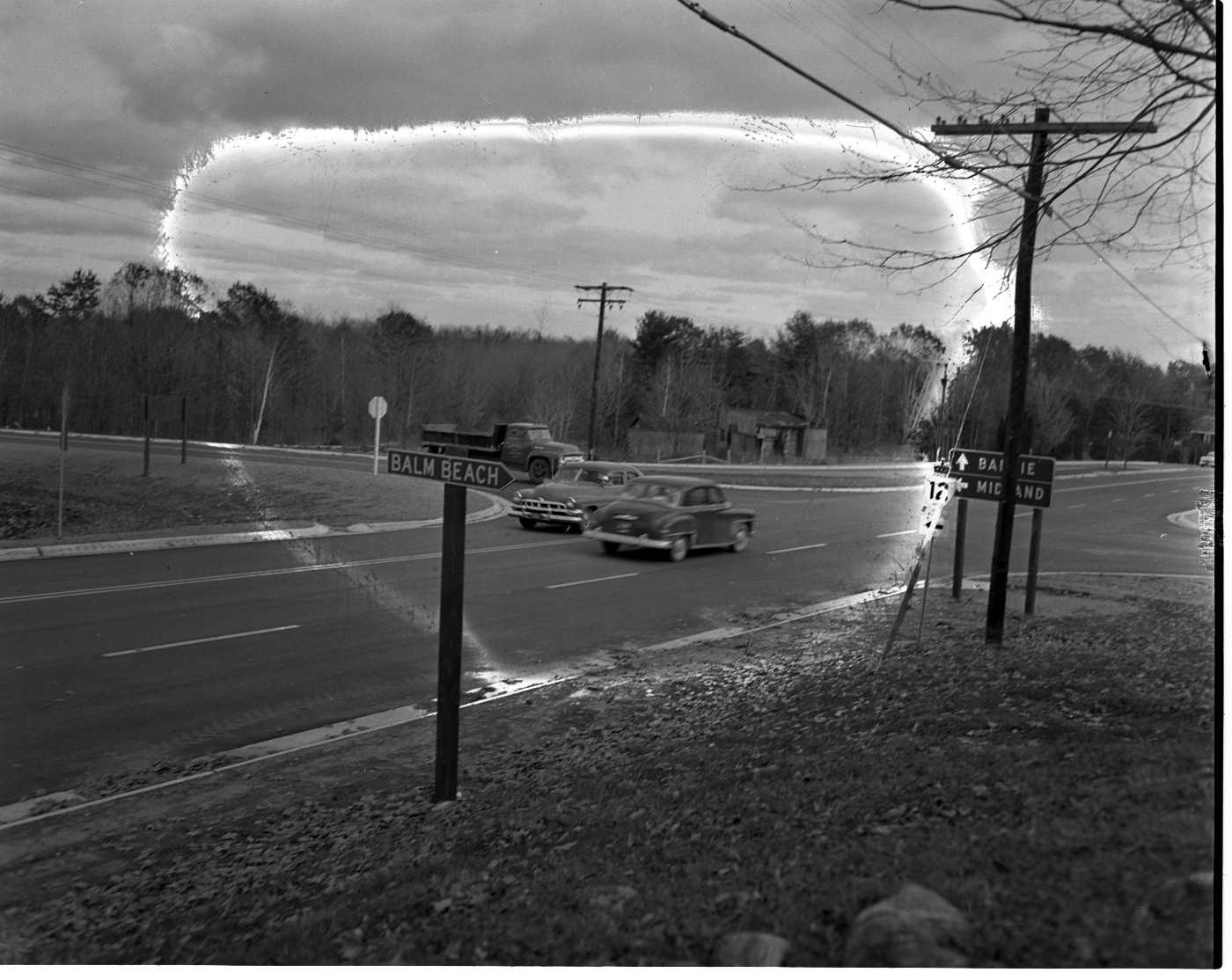 The new roadway at the junction of Highways 12 and 27, just west of Midland seems to be meeting with favour from most motorists. Above, a truck coming from Midland on Highway 12 is stopped prior to entering Highway 27. One car can be seen heading towards Penetang and the other towards Barrie on No. 27. Some motorists, travelling north on 27 have criticized the project finding the curve leading into Midland rather sharp.