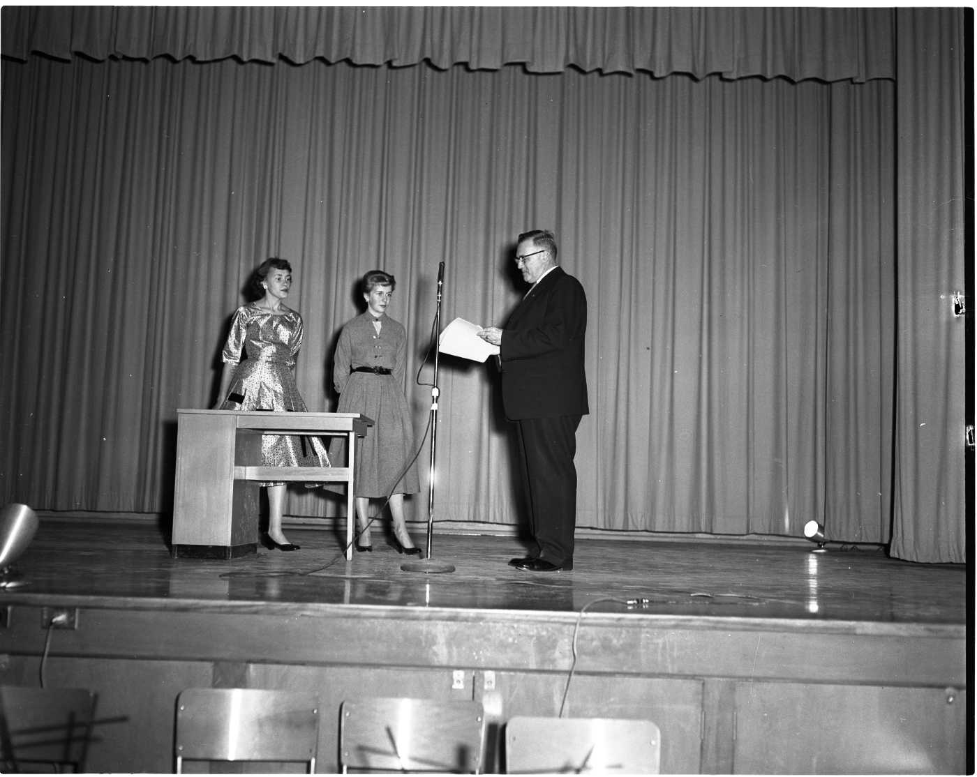 Former principal J. J. Robins was present at the MPDHS graduation exercises Friday night to present the Kiwanis Club scholarship of $50.00 for the highest and second highest aggregate marks in English, History and four options of the graduation diploma. Marion Gray and Wendy Howard tied for the top spot.