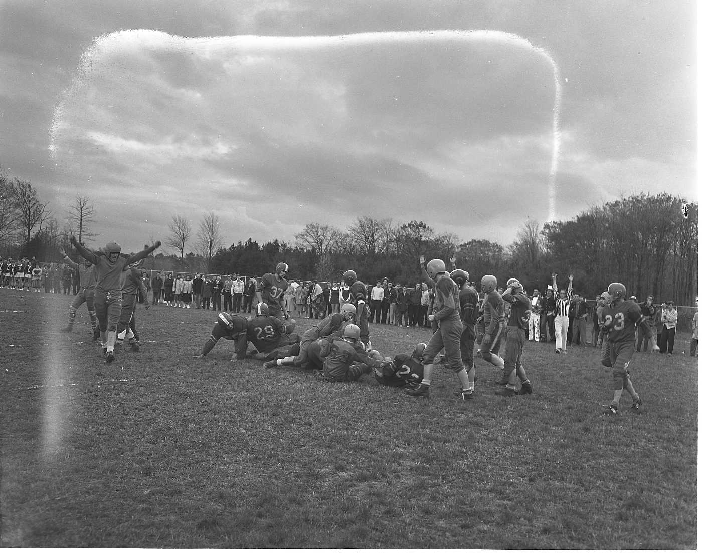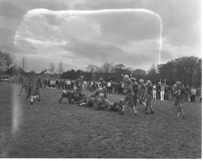 Somewhere beneath the pile is “Red” Glenn Nicholls who has just scored the second touchdown in the senior MPDHS senior teams 25 – 0 win over Orillia ODCVI at Midland Tuesday afternoon. The Purple and Gold scored one touchdown per quarter and have yet to be scored on this season.