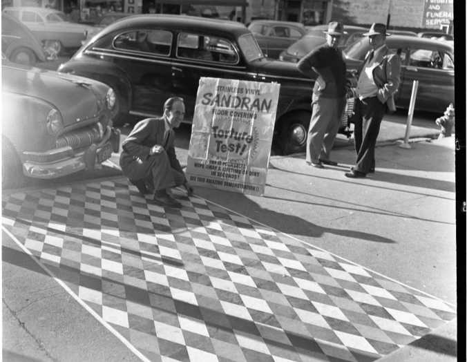 This new type of floor covering, stretching across the sidewalk in front of Edwards Specialty Shop also crossed the roadway and was an eye catcher for locals last weekend. Staff member Frank Harmsworth is seen with the display.